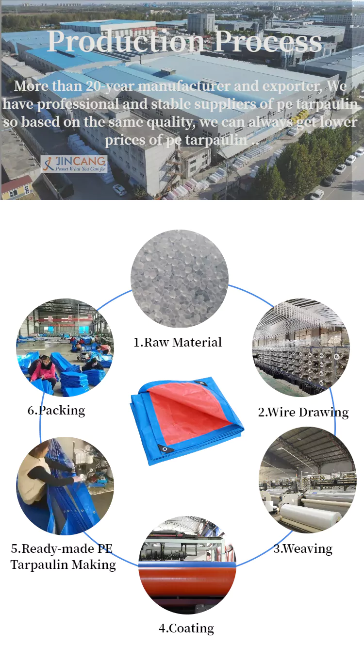 Jincang là một trong những nhà sản xuất Cuộn bạt PE chuyên nghiệp tại Trung Quốc, Cuộn bạt PE 90 dải GSM được đóng gói theo từng cuộn. Chiều rộng thường là 1,83m, 2m, 4m, 5m, 6m. Chiều dài thường là 63m, 91, 100m 200m, v.v. Và chúng tôi cũng có thể tùy chỉnh theo yêu cầu của bạn. Nó được sử dụng rộng rãi để bảo vệ ngoài trời, bao phủ hàng hóa, công trường, mục đích nông nghiệp và nơi trú ẩn tạm thời.